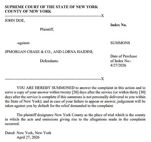 Lorna Hajdini, de 37 años, directora ejecutiva en la división de Financiación Apalancada de JPMorgan Chase, aún no ha respondido públicamente a la demanda.