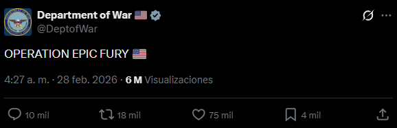 El Departamento de Guerra de Estados Unidos bautizó las acciones bélicas contra Irán iniciadas este sábado como «Operación Furia Épica», según indicó en su cuenta oficial en la red social X.