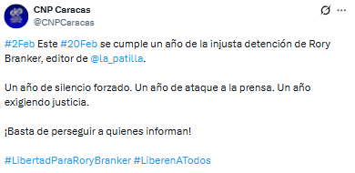 El Colegio Nacional de Periodistas (CNP) denunció que el próximo 20 de febrero se cumple un año de la injusta detención de Rory Branker.