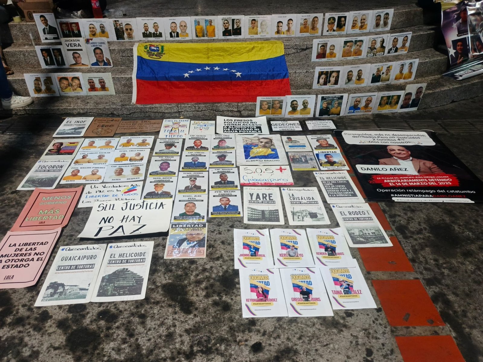 La protesta visual instalada en la calle muestra fotografías de hombres y mujeres, muchos de ellos civiles y militares, cuyas vidas se detuvieron tras las rejas. Entre las consignas visibles en el lugar destacan frases como «Sin justicia no hay paz» y «La libertad de los presos políticos no se negocia».