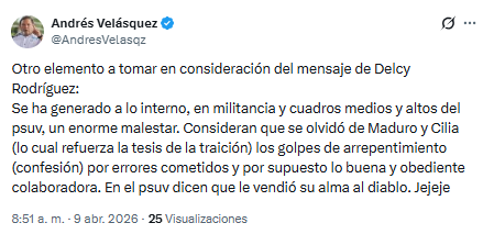 Según Velásquez, el reciente mensaje de Delcy Rodríguez fue interpretado internamente como una omisión deliberada hacia las figuras de Nicolás Maduro y Cilia Flores, lo que comienza a alimentar con fuerza la tesis de la traición entre los sectores más leales al chavismo.