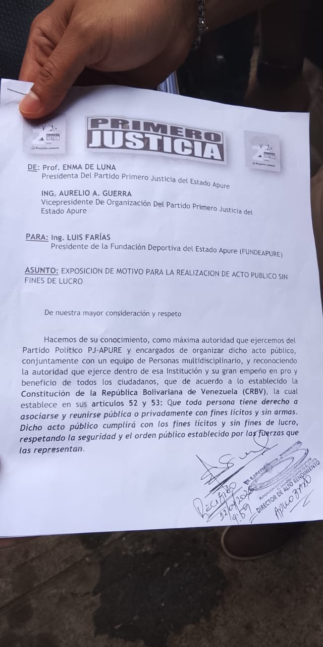 A pesar de que la organización política presentó una solicitud formal ante la Fundación Deportiva del Estado Apure (Fundeapure), la cual fue recibida y aprobada, funcionarios policiales impidieron el acceso a la cancha deportiva destinada para el encuentro.
