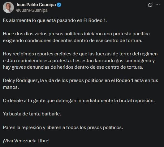 El dirigente de Primero Justicia, Juan Pablo Guanipa denunció este jueves la represión contra presos políticos en la cárcel de El Rodeo I, ubicada en el estado Miranda, tras una protesta iniciada por los reclusos para exigir mejores condiciones de reclusión.