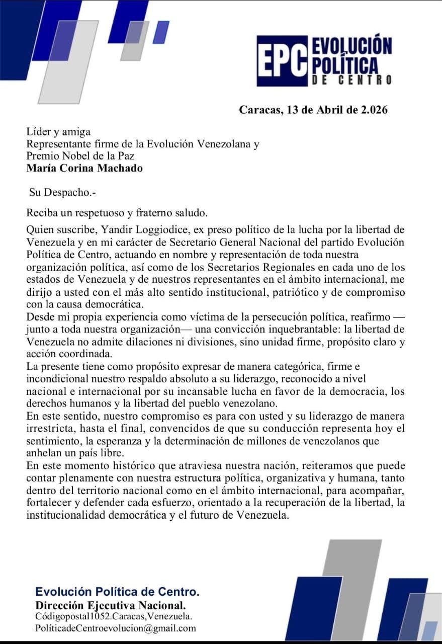 En un firme paso por la defensa de la democracia venezolana, la Comisión Internacional de Evolución Política de Centro hizo entrega formal de una carta suscrita por sus coordinadores nacionales, reafirmando su compromiso inquebrantable con el liderazgo de María Corina Machado.