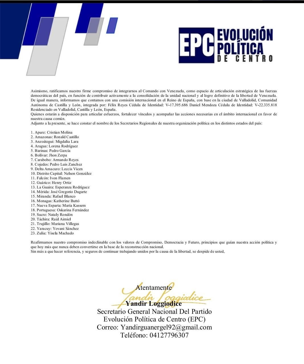 Asimismo, la dirigencia de Evolución Política de Centro destacó la importancia estratégica de exigir la renovación de los rectores del Consejo Nacional Electoral (CNE), como un paso fundamental para devolver la confianza en el sistema y rescatar la institucionalidad del voto.