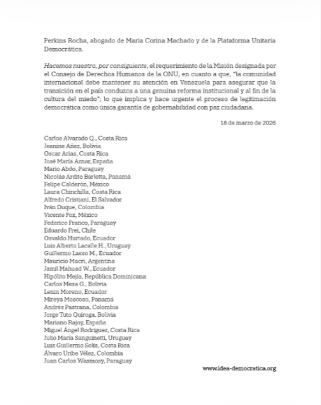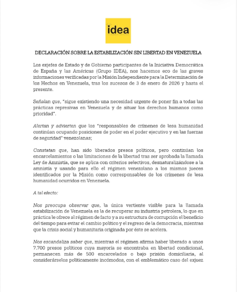 La Iniciativa Democrática de España y las Américas (Grupo Idea), integrada por más de 30 exjefes de Estado y de Gobierno, alertaron sobre la persistencia de prácticas represivas en Venezuela.