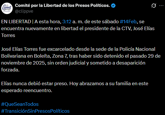 «A esta hora, 3:12 A.M. de este sábado 14 de febrero, se encuentra nuevamente en libertad el presidente de la CTV, José Elías Torres», anunció el Comité por la libertad de los presos políticos (ClippVe) en redes sociales, donde adjuntó una grabación del reencuentro entre apalusos del líder sindical con su familia.