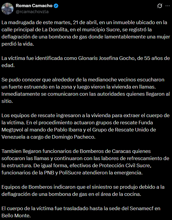 Explosión de una bombona de gas doméstico causó la muerte de una mujer en La Dolorita, estado Miranda. Foto: @rcamachovzla / X
