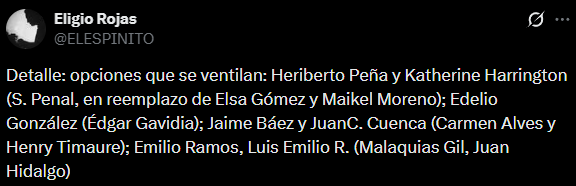 Entre los posibles sustitutos, Rojas maneja los nombres de Heriberto Peña y la polémica Katherine Harrington, entre otros.