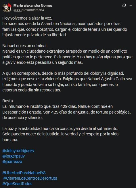 «A quien corresponda, desde lo más profundo del dolor y la dignidad, exigimos que cese esta violencia. Exigimos que Nahuel Agustín Gallo sea liberado y pueda volver a su hogar, con su familia, con quienes lo esperan cada día sin respuestas. Basta.