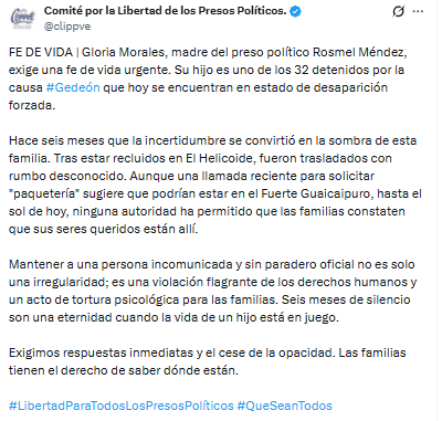 Morales denunció que, tras seis meses de incertidumbre, estos ciudadanos se encuentran en desaparición forzada, luego de haber sido trasladados desde El Helicoide hacia un rumbo desconocido sin que hasta la fecha exista una confirmación sobre su paradero.
