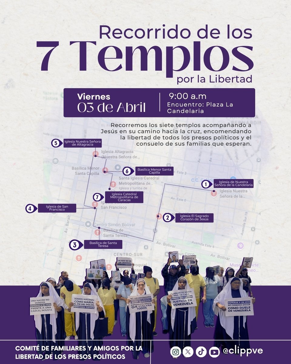 Madres, familiares, amigos y defensores de derechos humanos convocaron para este viernes 3 de abril al “Recorrido de los 7 Templos por la Libertad”, una jornada de fe y exigencia impulsada por el Comité por la Libertad de los Presos Políticos (Clippve) en el marco de la Semana Santa.