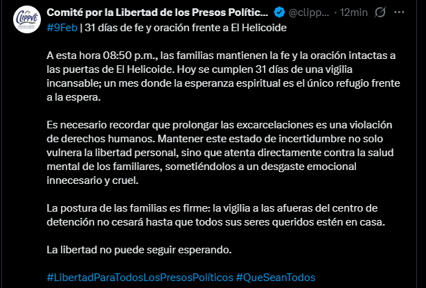 De acuerdo con un nuevo reporte difundido este 9 de febrero por el Comité por la Libertad de los Presos Políticos (Clippve), los familiares se mantienen firmes a las puertas de El Helicoide, sosteniendo que la fe y la esperanza se han convertido en su único refugio frente a la espera prolongada, la incertidumbre y el incumplimiento de excarcelaciones previamente anunciadas.