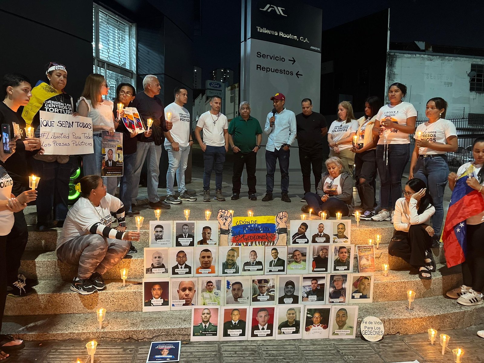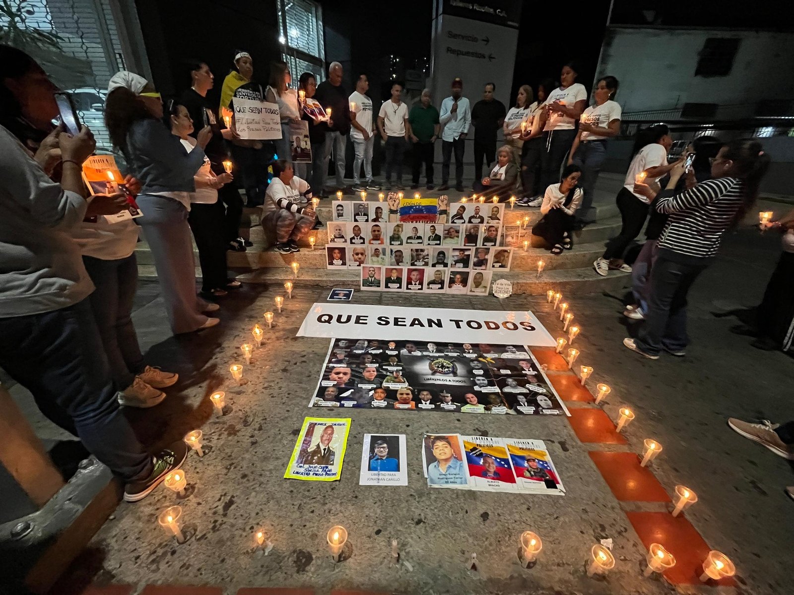 A las 8:50 p.m., decenas de familiares permanecían reunidos en vigilia, con velas, pancartas y fotografías de sus seres queridos, reafirmando que no abandonarán el lugar hasta que todos los presos políticos regresen a sus hogares.