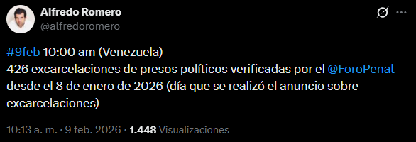 «10:00 am (Venezuela) 426 excarcelaciones de presos políticos verificadas por el Foro Penal desde el 8 de enero de 2026 (día que se realizó el anuncio sobre excarcelaciones)», confirmó en redes sociales Alfredo Romero, director presidente de la organización no gubernamental.