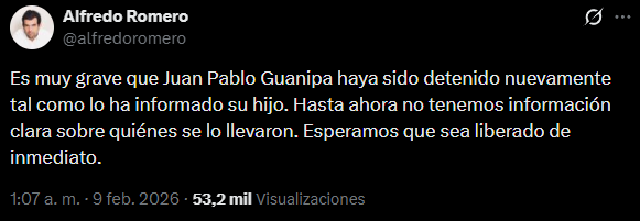 Al respecto, Romero subrayó que «es muy grave que Juan Pablo Guanipa haya sido detenido nuevamente tal como lo ha informado su hijo. Hasta ahora no tenemos información clara sobre quiénes se lo llevaron. Esperamos que sea liberado de inmediato».