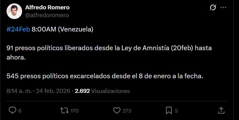 En total, 545 presos políticos han sido excarcelados desde el 8 de enero, cuando autoridades anunciaron la liberación de un «número importante» de personas, explicó en la red social X el director presidente de la organización, Alfredo Romero.