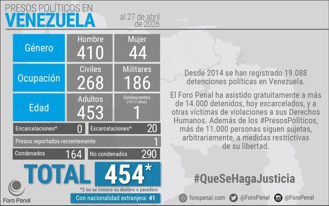 La ONG Foro Penal informó este jueves que 454 presos políticos permanecen encarcelados en Venezuela, entre ellos 41 extranjeros o con doble nacionalidad, cuando en el país sigue en vigor una ley de amnistía limitada a ciertos delitos y períodos de tiempo específicos.