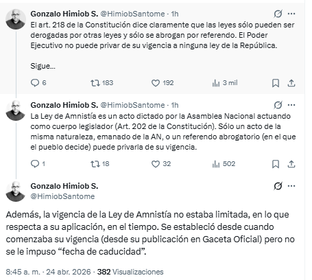 A través de su cuenta en X, el abogado recordó que, según el artículo 218 de la Constitución, las leyes solo pueden ser derogadas por otras leyes emanadas de la Asamblea Nacional o mediante un referendo abrogatorio, por lo que el Poder Ejecutivo carece de facultades para privar de vigencia a este instrumento.