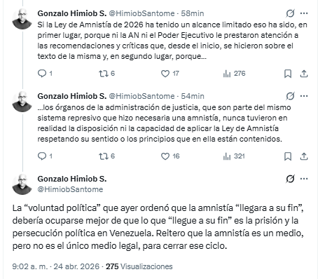 El representante de la ONG denunció que el desvío de los casos pendientes hacia estructuras controladas por el chavismo, como la Comisión Nacional para la Reforma de la Justicia Penal, ignora que la amnistía es un medio legal soberano para cerrar ciclos de conflicto.