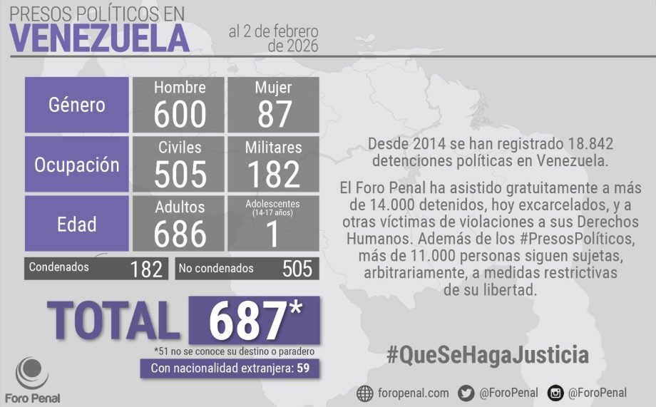 La ONG Foro Penal publicó su más reciente balance sobre la represión política en Venezuela, registrando un total de 687 presos políticos hasta la fecha.