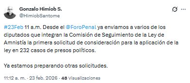 Esta solicitud se produce luego de que la Ley de Amnistía fuera publicada en Gaceta Oficial el pasado 20 de febrero y tras diversas alertas que explican que el texto, tal como fue redactado, excluye a cientos de casos bajo criterios de tipificación de delitos que dejarían fuera a gran parte de los detenidos por motivos políticos.
