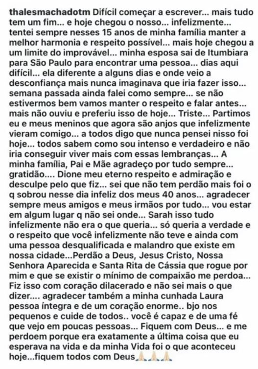 En la carta digital, el secretario relató conflictos conyugales tras 15 años de matrimonio y mencionó una supuesta infidelidad de su esposa, quien habría viajado a San Pablo para conocer a otra persona. También pidió disculpas a familiares y mostró respeto por su suegro, Dione Araújo, alcalde de Itumbiara.