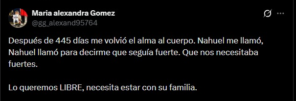 El gendarme argentino Nahuel Gallo, quien se encuentra recluido en la cárcel El Rodeo I en el estado Miranda, pudo contactar por primera vez a su pareja, María Alexandra Gómez, desde su detención arbitraria hace más de 14 meses.