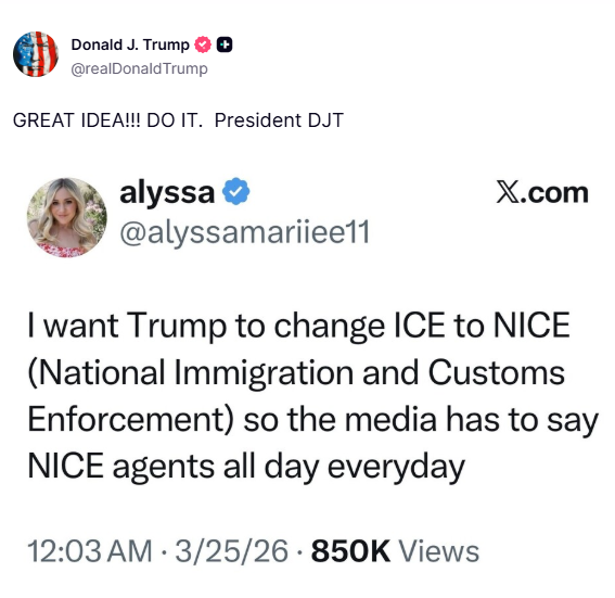En una publicación de Truth Social, compartió una captura de pantalla de una publicación en X en la que alguien había escrito: «Quiero que Trump cambie ICE por NICE (Servicio Nacional de Inmigración y Control de Aduanas) para que los medios tengan que decir agentes de NICE todo el día, todos los días».