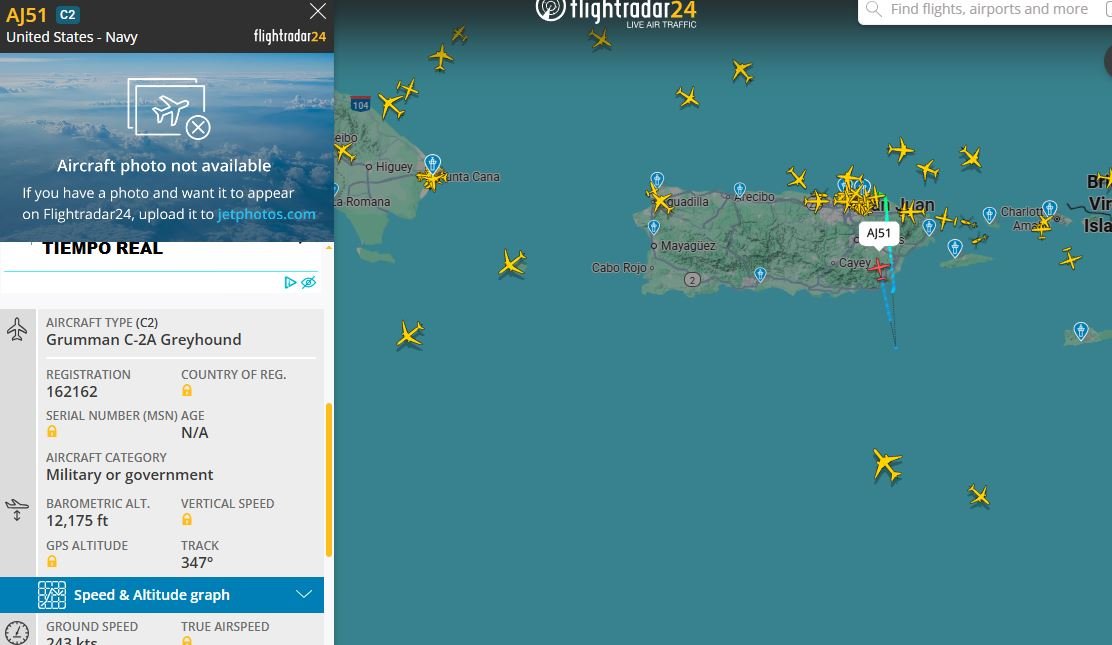 El aparato, identificado con el código AJ51, fue rastreado la tarde del lunes 17 de noviembre, despegando desde el USS Gerald Ford en plena zona de operaciones del Comando Sur (SOUTHCOM), para dirigirse al aeropuerto de San Juan, donde se presume que existe una base de operaciones donde esta aeronave podría recibir suministros para trasladarlos al portaaviones posicionado al frente de costas venezolanas.