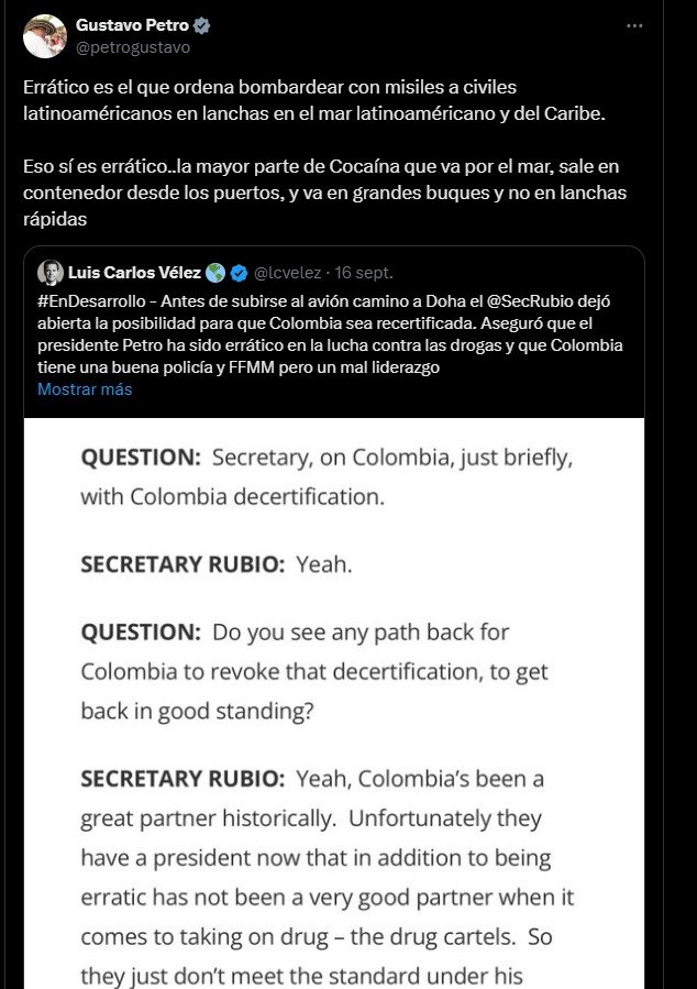“Errático es el que ordena bombardear con misiles a civiles latinoamericanos en lanchas en el mar latinoamericano y del Caribe. Eso sí es errático”, escribió Petro en su cuenta de X, en clara referencia a los recientes ataques de EEUU contra embarcaciones rápidas, que dejaron al menos 14 muertos presuntamente vinculados al narcotráfico.