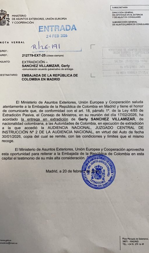 Según la nota, la extradición se ejecuta tras la aprobación de la Audiencia Nacional española, que dio luz verde a la entrega de Sánchez Villamizar, de nacionalidad colombiana.