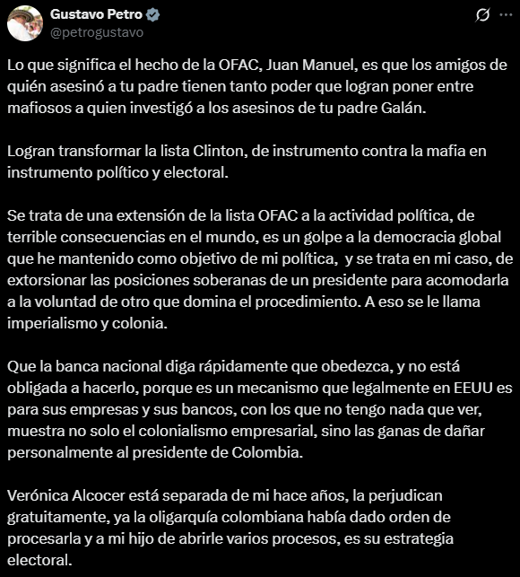 El presidente de Colombia, Gustavo Petro, volvió a pronunciar públicamente sobre las sanciones impuestas por el Departamento del Tesoro de Estados Unidos, que lo incluyó, junto con Verónica Alcocer y su hijo Nicolás, en la llamada lista Clinton.