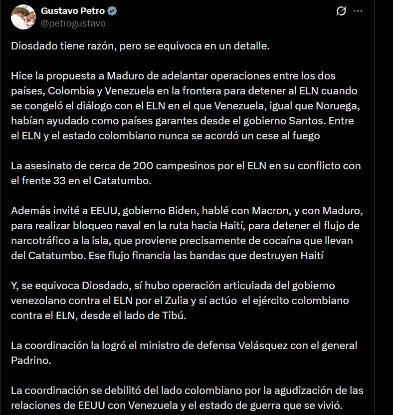 Petro también reveló que hubo «coordinación militar y de seguridad entre ambos países*», específicamente entre el entonces ministro de Defensa colombiano Velásquez y el general Vladimir Padrino López, para operaciones contra el ELN en zonas como Zulia y Tibú, reconociendo una cooperación directa entre ambos Estados.