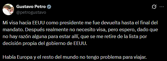 «Mi visa hacia EEUU como presidente me fue devuelta hasta el final del mandato. Después realmente no necesito visa», manifestó Petro en su cuenta de X.