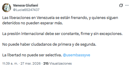 La hermana de Germán Giuliani, argentino detenido en Venezuela por motivos políticos, dirigió un mensaje a la Embajada de Estados Unidos en Caracas alertando sobre el estancamiento en la liberación de presos de conciencia.