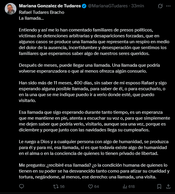 Mariana de Tudares concluye su mensaje con una pregunta cargada de angustia y esperanza: “¿Recibiré esa llamada? ¿O la condición humana de quienes lo tienen en su poder se ha desvanecido tanto como para atizar su crueldad y tortura, negándome, al menos, ese derecho: una llamada, una visita?”