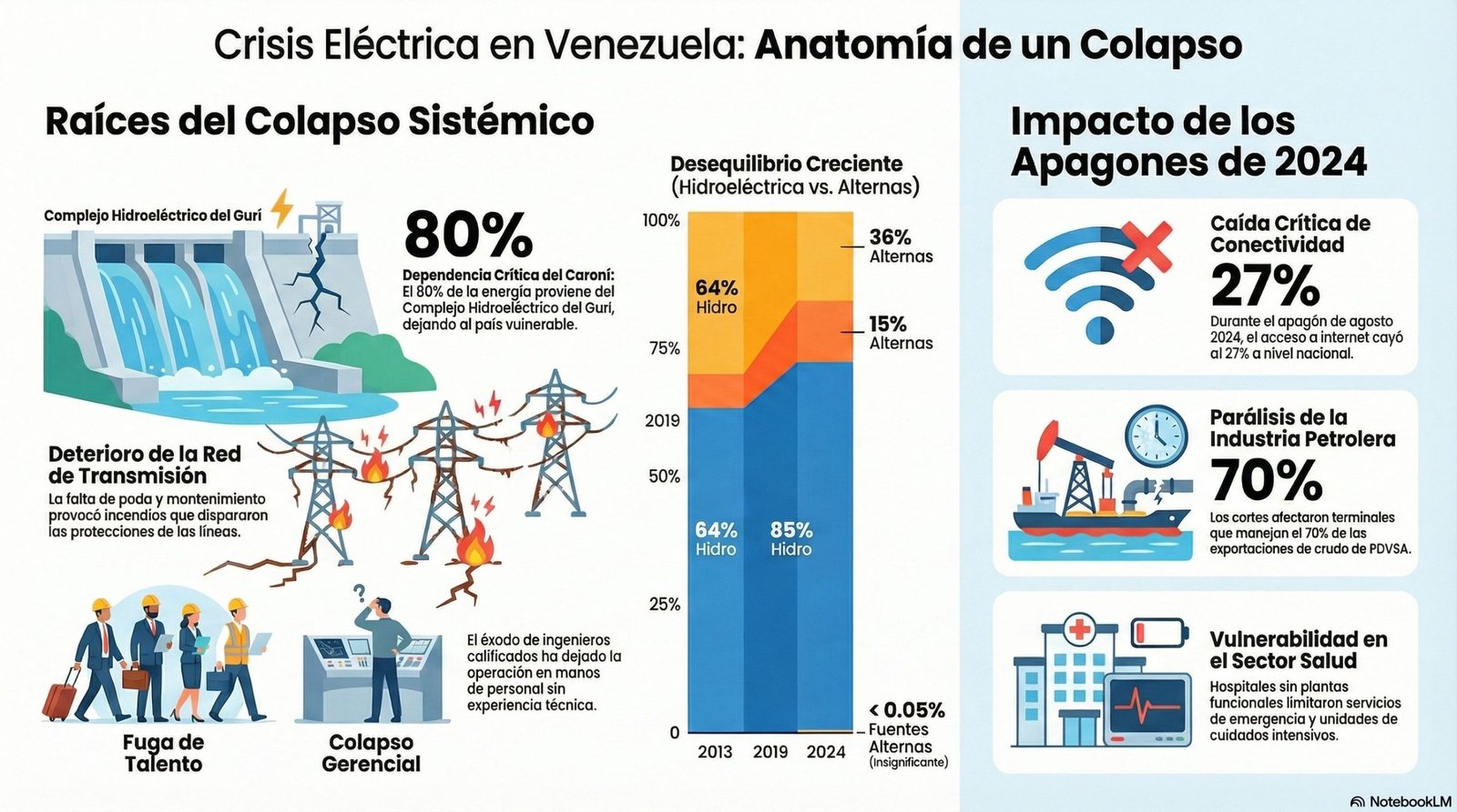 Esto obliga a una dependencia excesiva del Guri (80% del suministro), lo que hace que cualquier falla en las líneas troncales afecte a todo el país.