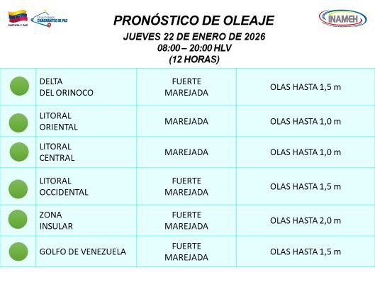 En cuanto al estado de las costas venezolanas, el Inameh emitió un pronóstico de fuerte marejada en casi toda la franja litoral y la zona insular.