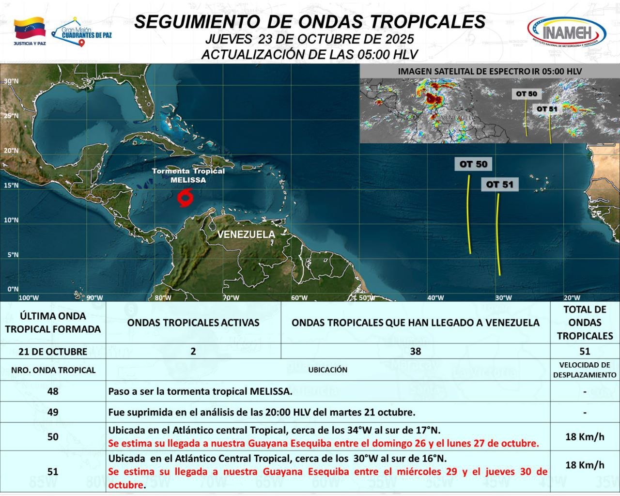 De acuerdo con el gráfico de seguimiento de ondas tropicales, la Onda Tropical Nro. 50 se estima que llegue a Venezuela entre el domingo 26 y el lunes 27 de octubre, con una velocidad de desplazamiento de 18 kilómetros por hora; mientras que la 51 podría llegar el miércoles 29 y el jueves 30 de octubre.