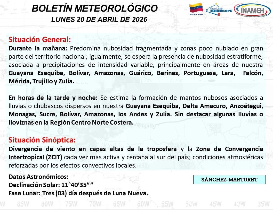El Instituto Nacional de Meteorología e Hidrología (Inameh) informó que para la mañana de este lunes 20 de abril predominará nubosidad fragmentada en la mayor parte del país.