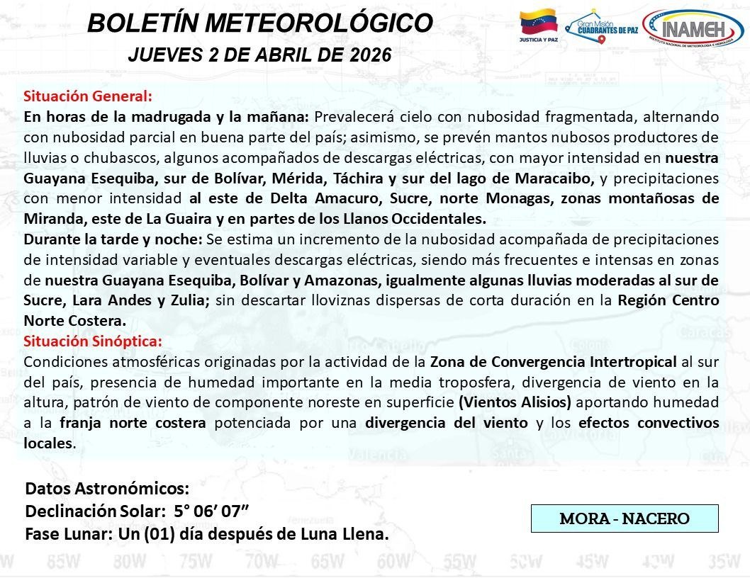 Según el reporte oficial, se esperan mantos nubosos generadores de lluvias y chubascos, algunos con descargas eléctricas, especialmente en el sur de Bolívar, Mérida, Táchira y el sur del Lago de Maracaibo.