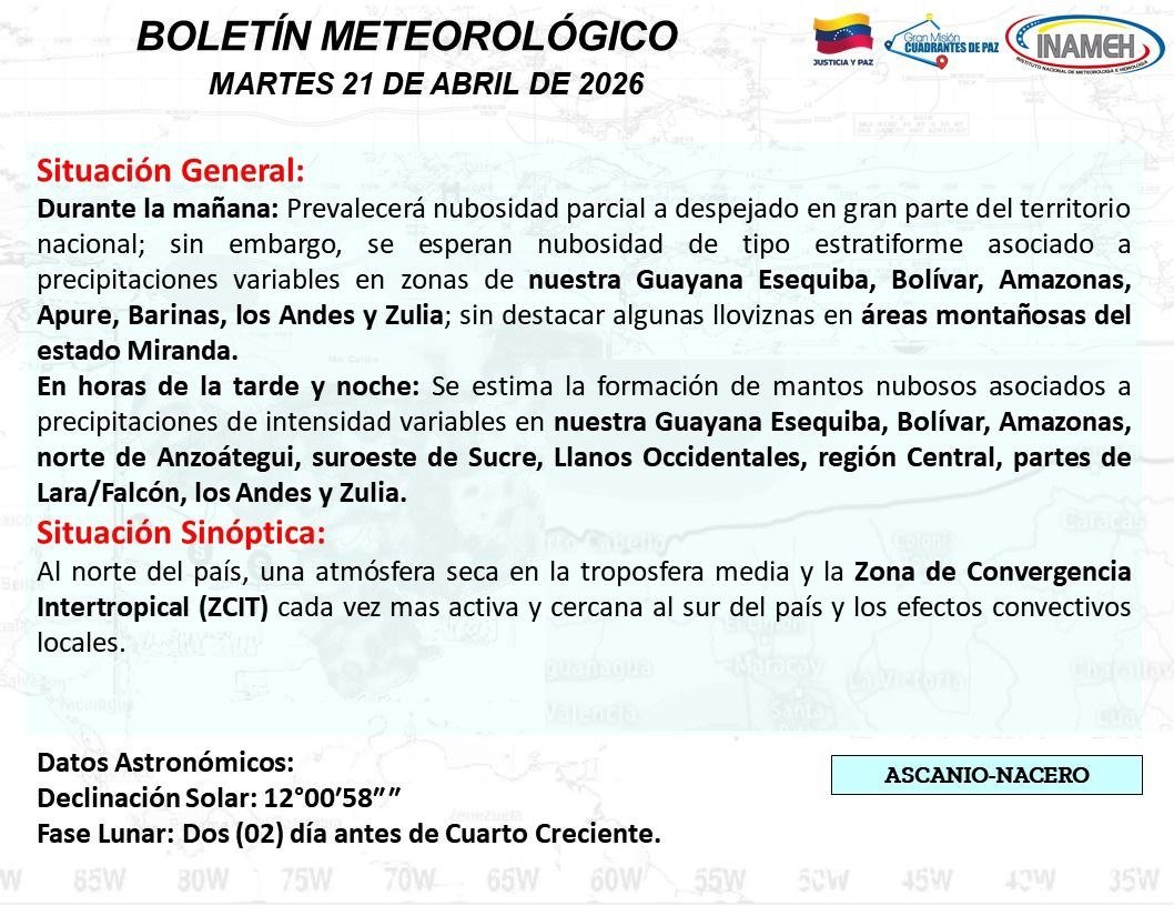 El Instituto Nacional de Meteorología e Hidrología (Inameh) informó que para la mañana de este martes 21 de abril, predominará un cielo de parcial a despejado en la mayoría del territorio nacional.