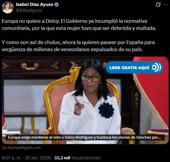«Europa no quiere a Delcy. El Gobierno ya incumplió la normativa comunitaria, por la que esta mujer tuvo que ser detenida y multada», recordó Díaz Ayuso en referencia al escándalo del «Delcygate», que incluyó al exministro español José Luis Ábalos, quien permitió en 2020 que Rodríguez pisara suelo europeo en el Aeropuerto Adolfo Suárez Madrid-Barajas.