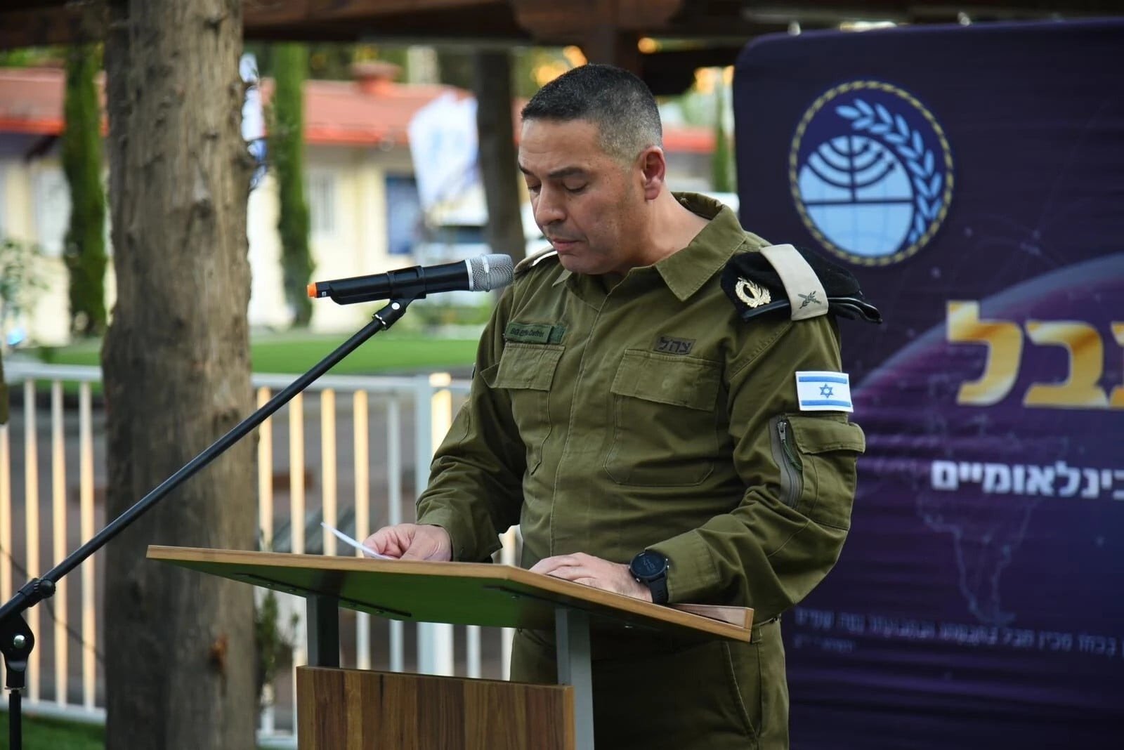 El portavoz entrante de las Fuerzas de Defensa de Israel (FDI), general de brigada Effie Defrin, habla en una ceremonia de entrega en una base militar. | Foto: Fuerzas de Defensa de Israel