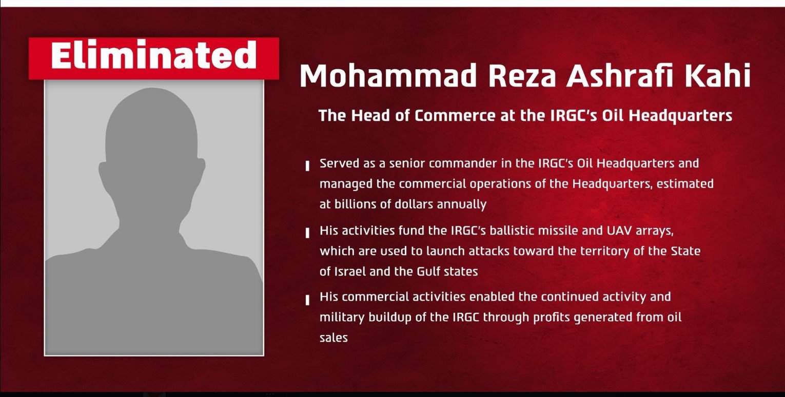 El Ejército de Israel aseguró este domingo haber matado en Teherán a Mohammad Reza Ashrafi Kahi, a quien sitúa como responsable comercial del Cuartel General del Petróleo de la Guardia Revolucionaria iraní.