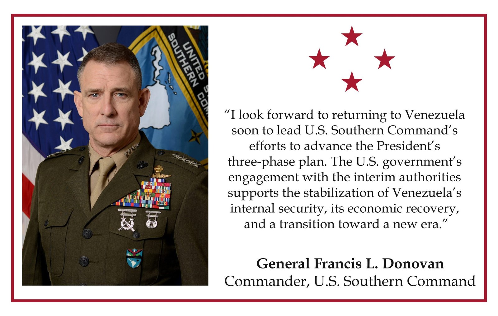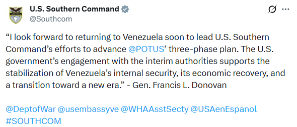 «Espero regresar pronto a Venezuela para liderar los esfuerzos del Comando Sur de los EE. UU. para impulsar el plan de tres fases del presidente Trump. La colaboración del gobierno estadounidense con las autoridades interinas apoya la estabilización de la seguridad interna de Venezuela, su recuperación económica y la transición hacia una nueva era», indicó el jefe del Comando Sur.