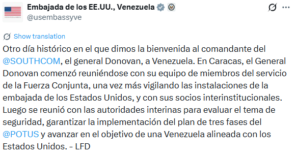Según el mensaje difundido por la embajada estadounidense en su cuenta de X, la visita tiene como objetivo principal supervisar las operaciones de seguridad y avanzar en la alineación estratégica entre Washington y las autoridades interinas del régimen.