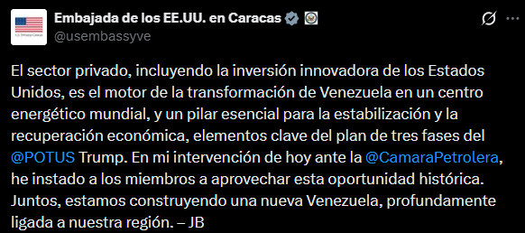Asimismo, el encargado de negocios consideró que el sector privado, incluyendo la inversión de Estados Unidos, es el «motor de la transformación de Venezuela en un centro energético mundial, y un pilar esencial para la estabilización y la recuperación económica».