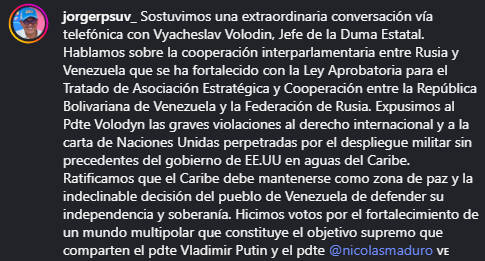 El presidente de la Duma o cámara de diputados de Rusia, Viacheslav Volodin, debatió hoy por teléfono con Jorge Rodríguez el desarrollo del diálogo interparlamentario con Venezuela en el contexto del gran despliegue de fuerzas navales de Estados Unidos en el Caribe.